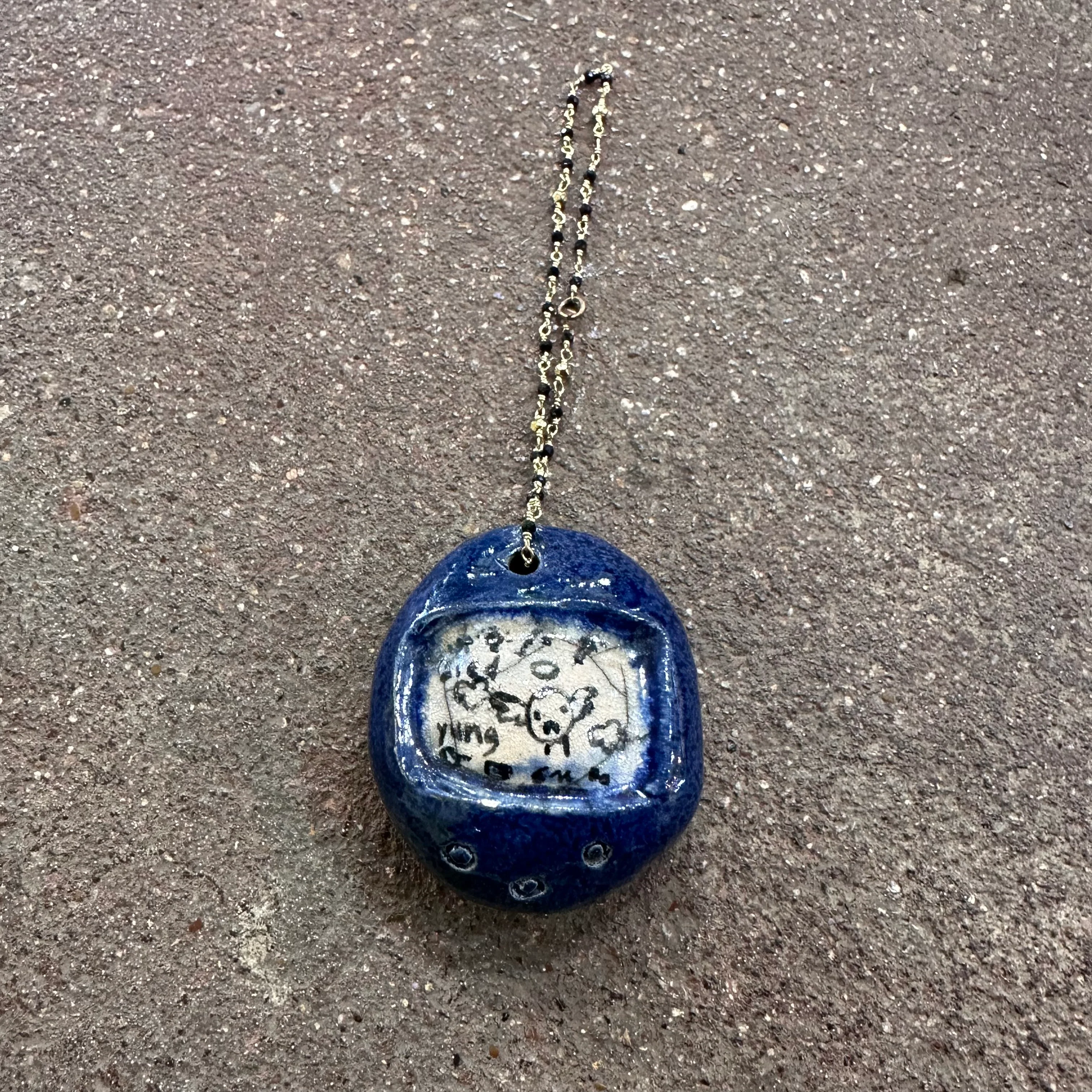 Take a nostalgic trip back to the '90s with these charming handmade ceramic Tamagotchi pendants by Dallas artist Mylan Nguyen. Measuring approximately 2–2.5" tall by 1–1.5" wide and weighing just 2–3 oz, each piece features whimsical hand-drawn "screen" details that capture the playful spirit of virtual pets. Perfect as a quirky necklace charm or decorative keepsake, these pendants are crafted with love and a dash of retro flair, making them the perfect gift for Tamagotchi fans or anyone who loves unique, handcrafted art.